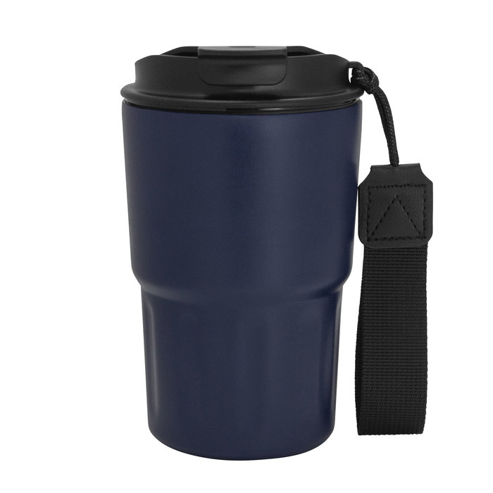 Mug doble pared, sellado al vacío. Mug con aislamiento térmico. Tecnología vacuum. Interior en acero 304 y exterior en acero 201. Tapa de polipropileno con anillo de silicona y correa de poliéster en color negro. Pintura acabado mate. Mantiene hasta 8 hs la temperatura de las bebidas calientes y hasta 12 hs la de las bebidas frías.