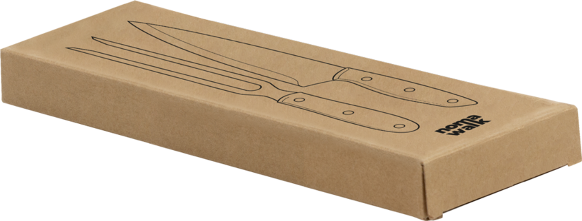 34 x 9,7 x 2,5 cm (caja) . Acero inoxidable 420 y madera. Set de 2 utensilios: tenedor y cuchillo de 31,4 cm, ambos con mango de madera. Presentación en caja de regalo Kraft.