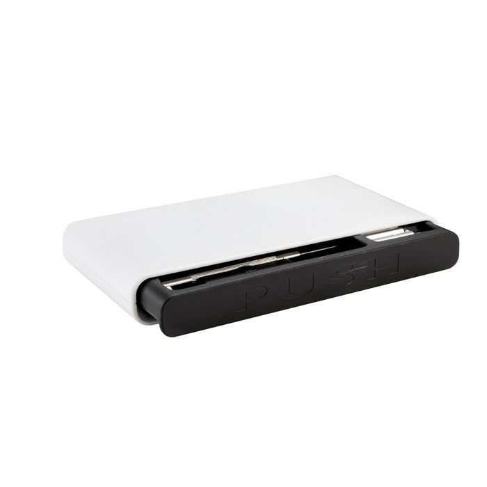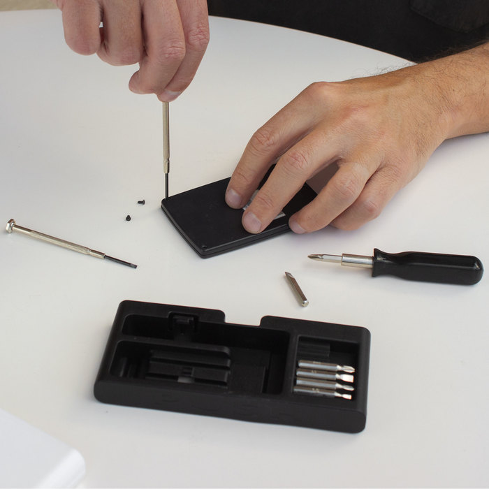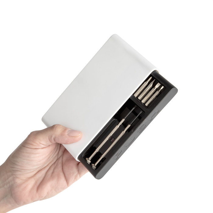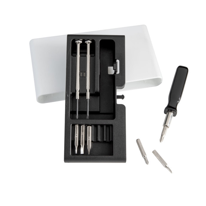 Set de destornilladores. Incluye: 1 mango con punta imantada, 6 puntas diferentes (3 planas: 1,5 ; 3 y 4 mm. y 3 phillips: 0000, 0 y 1mm.) y 2 destornilladores de precisión (1 plano y 1 phillips). Base imantada que permite mantener ordenadas las diferentes puntas. Apertura push.